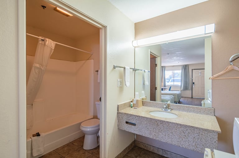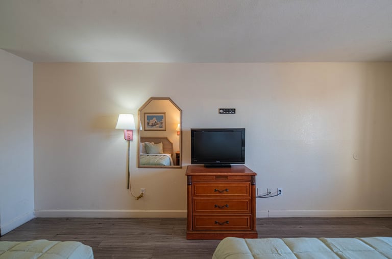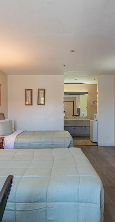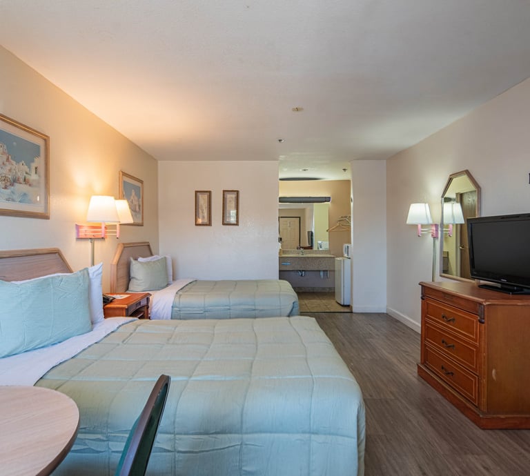 Two comfortable queen beds, perfect for couples, families, teams or other shared stays. Includes private bathroom, a table with chairs or comfortable couch for remote work, TV, air conditioning, refrigerator and more.
